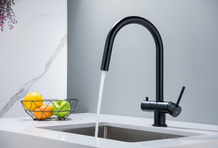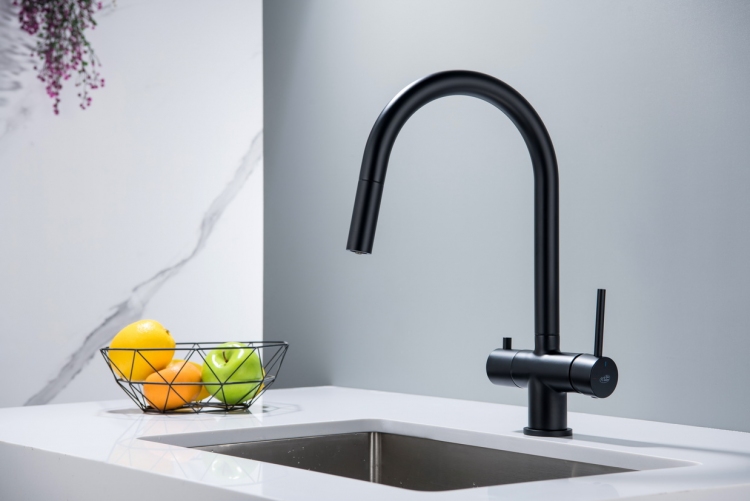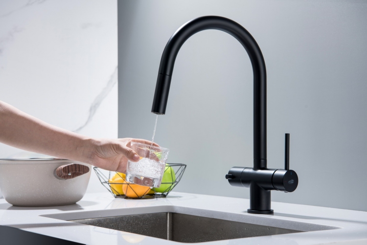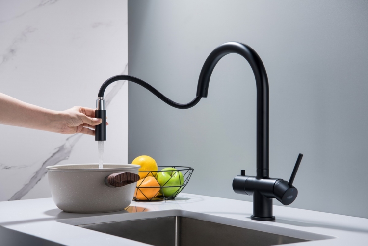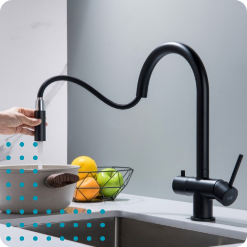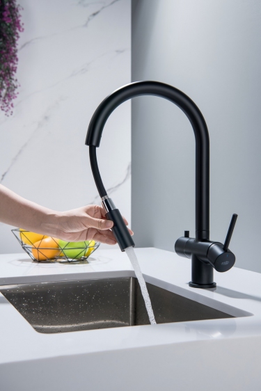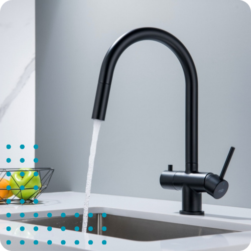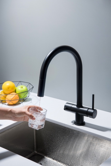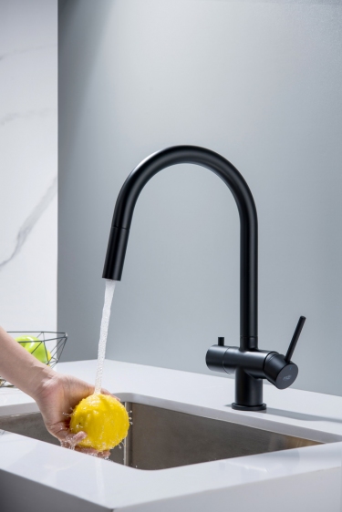 Bateria łączy w sobie: funkcjonalność (mieszanie wody + dostęp do wody filtrowanej), elastyczność (wylewka wysuwana i obrotowa), wysoki komfort użytkowania i estetyczny design