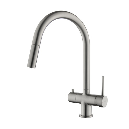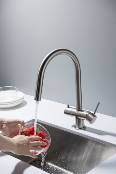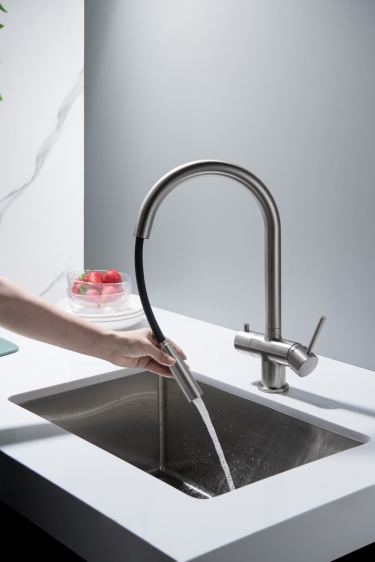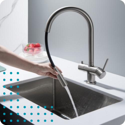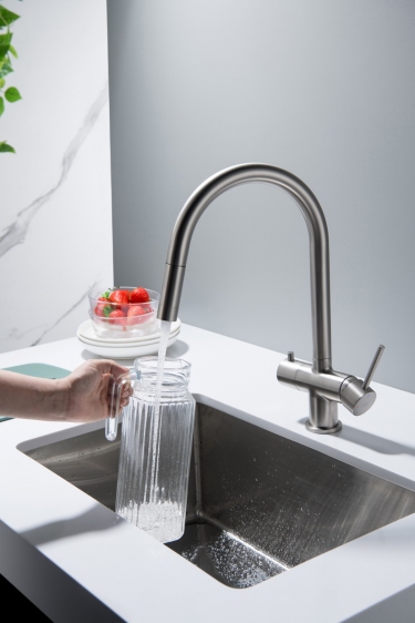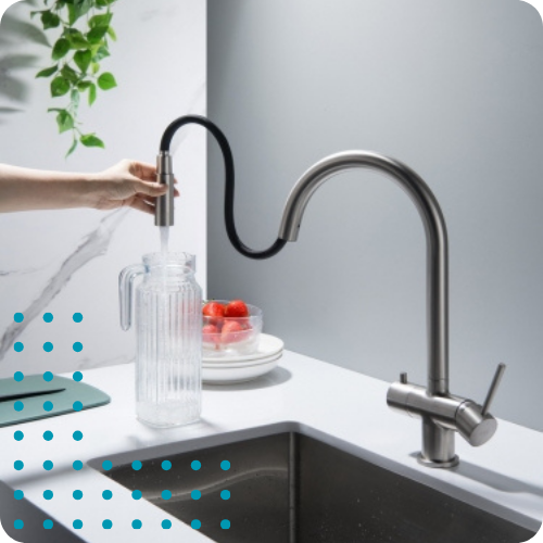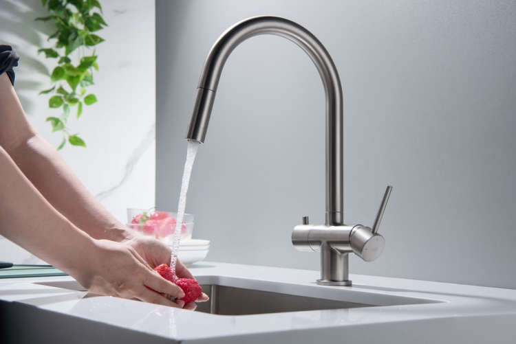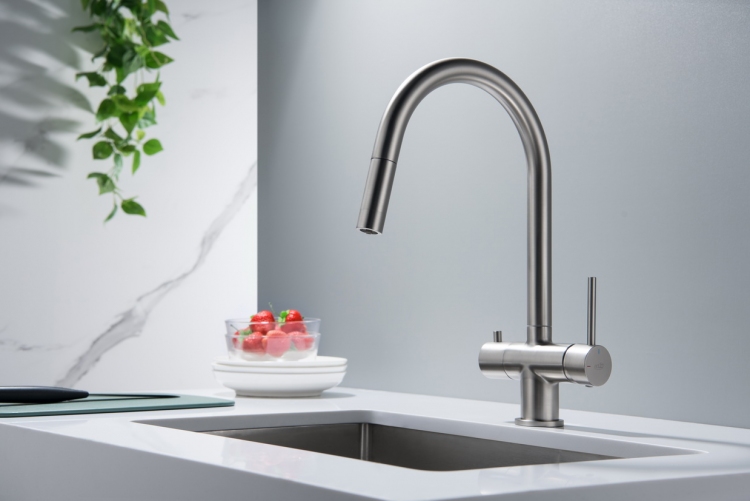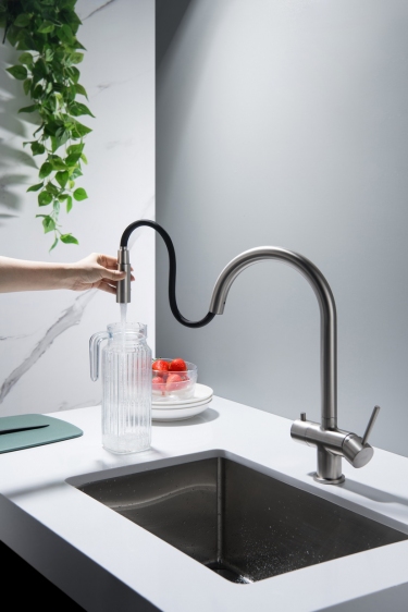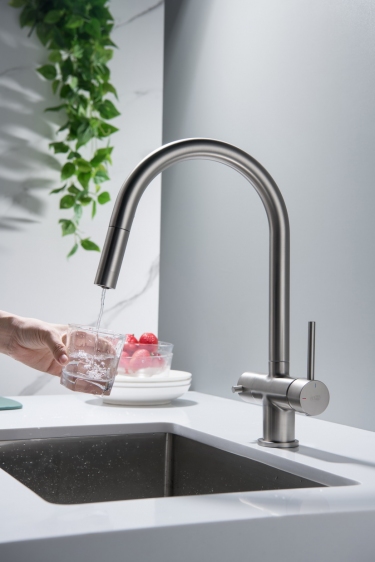 Bateria łączy w sobie: funkcjonalność (mieszanie wody + dostęp do wody filtrowanej), elastyczność (wylewka wysuwana i obrotowa), wysoki komfort użytkowania i estetyczny design